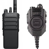 Monofonen er utstyrt med to PTT-knapper – én på siden og én foran – som gir fleksibel og intuitiv betjening uansett brukssituasjon. På baksiden sitter en solid, justerbar belteklips som sikrer at monofonen holder seg trygt på plass, også under aktiv bruk.
