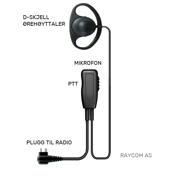 Med vårt D-skjell security sett får du lyden direkte på øret.  Myk og god ørebøyle som gjør at selve ørehøyttaler sitter godt.  Ledning går ned til PTT med mikrofon, derfra til radio.  D-skjell PTT passer radio med Motorola M1/M tilbehørskontakt, dvs 2.5mm / 3.5mm.  God kvalitet !